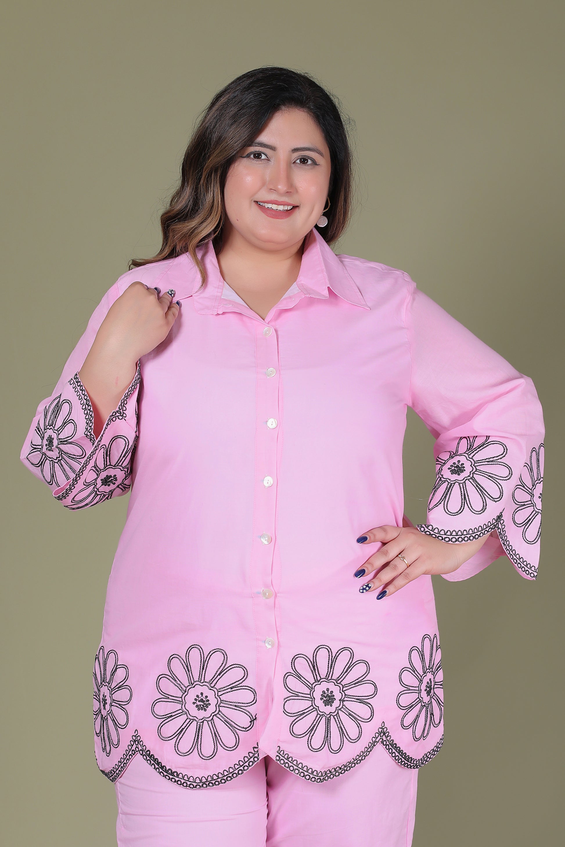 SOLID FLORAL EMBROIDERY COTTON CO-ORD SET IN BABY PINK BY PLUSSIZEKURTI