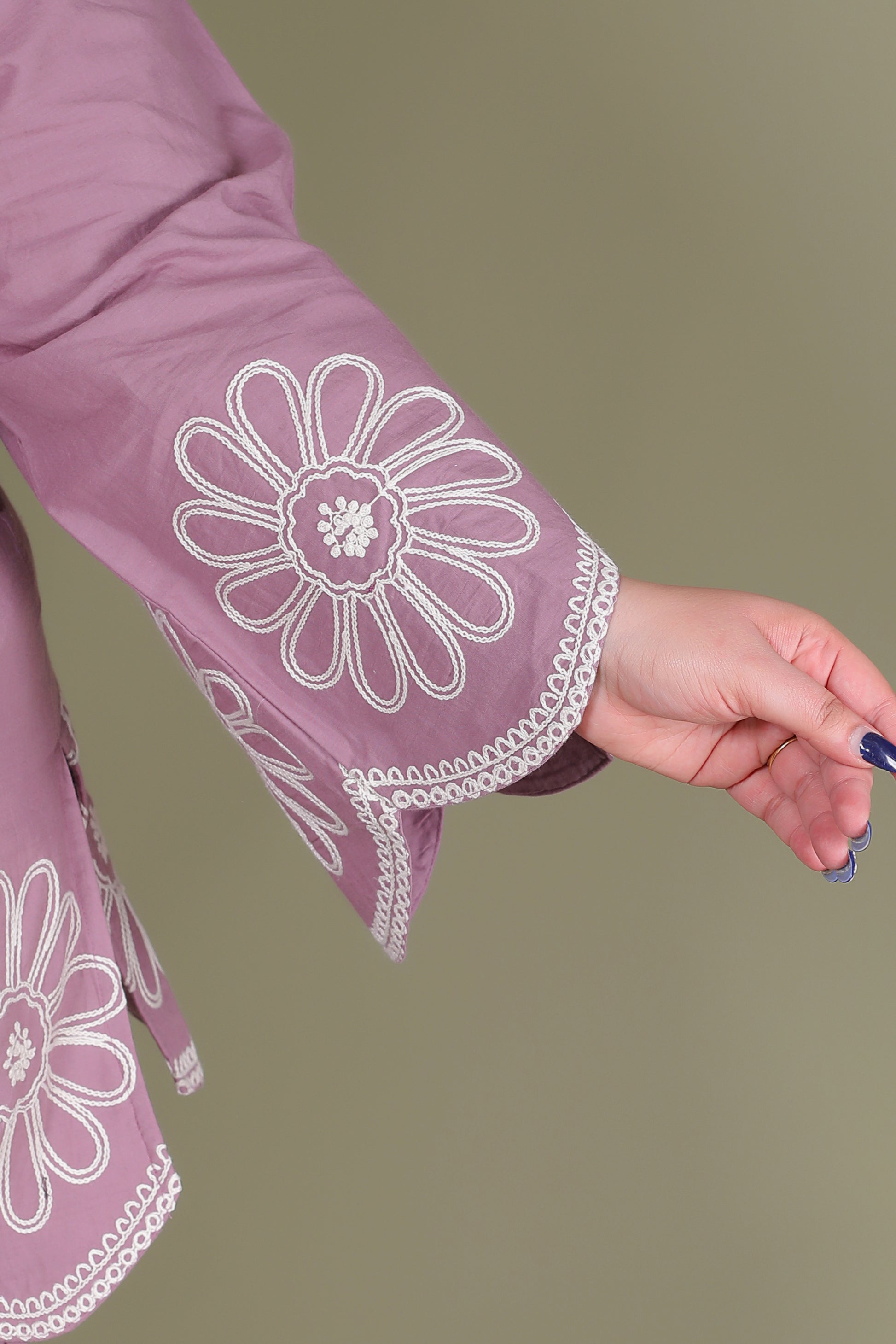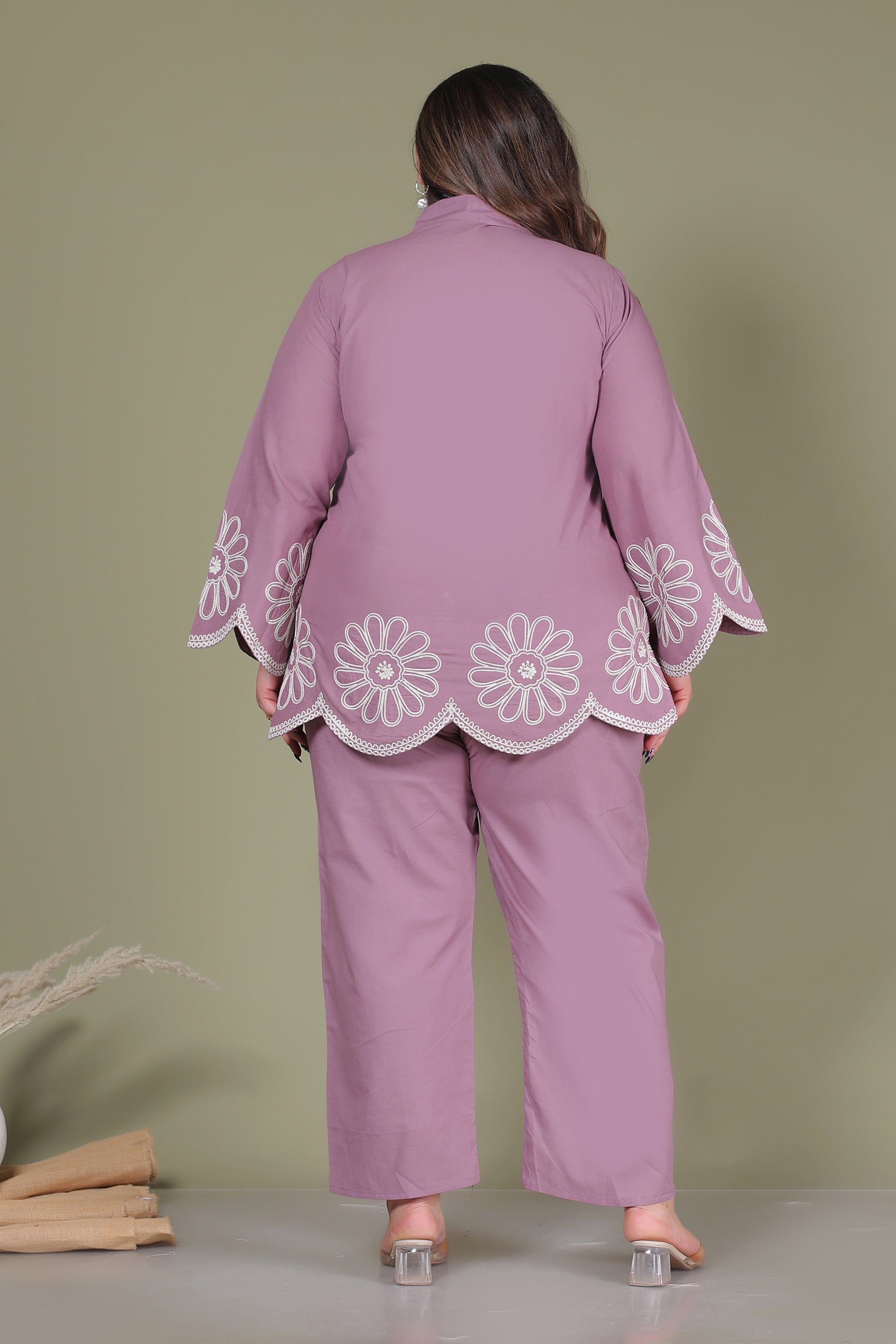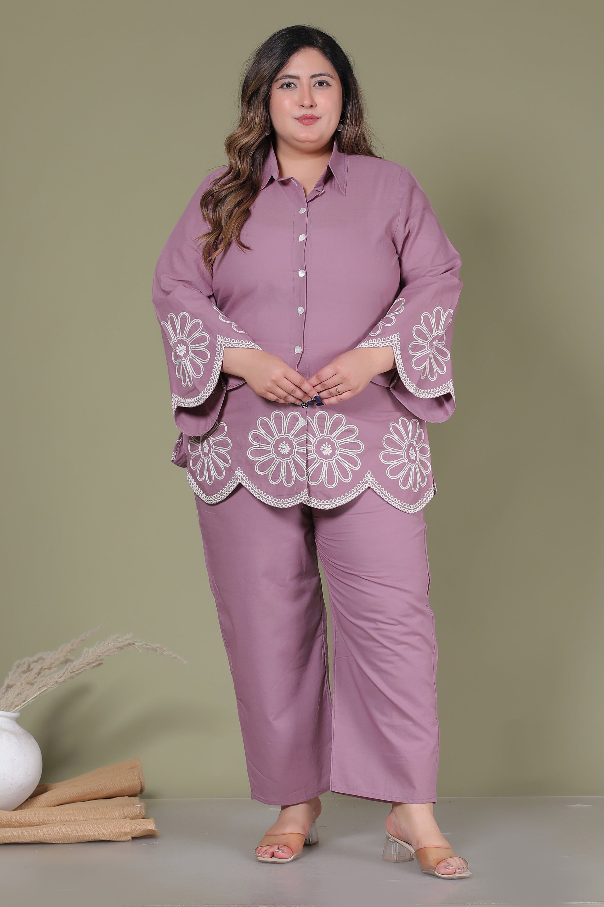 SOLID FLORAL EMBROIDERY COTTON CO-ORD SET IN LAVENDER BY PLUSSIZEKURTI