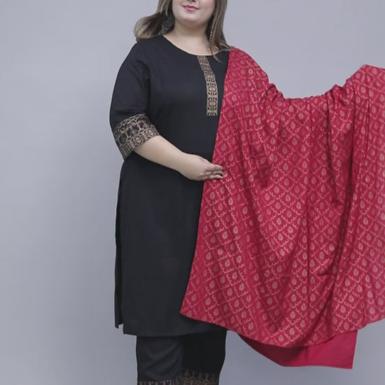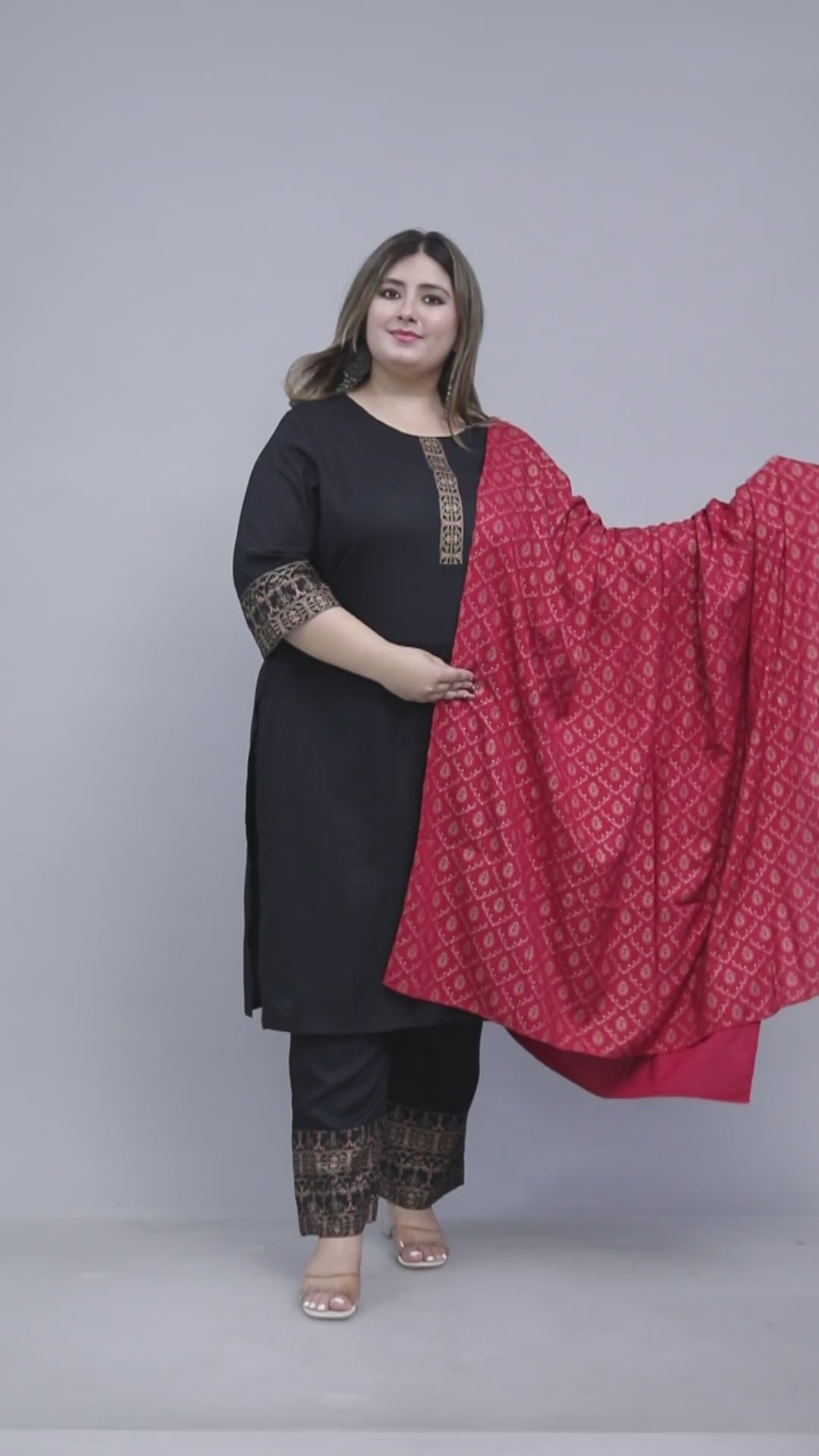 Key Features: Black base | Golden ethnic foil detailing | Round neckline with 3/4 sleeves | Coordinated pant | Red dupatta with golden lattice motifs