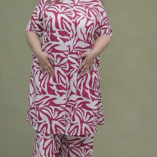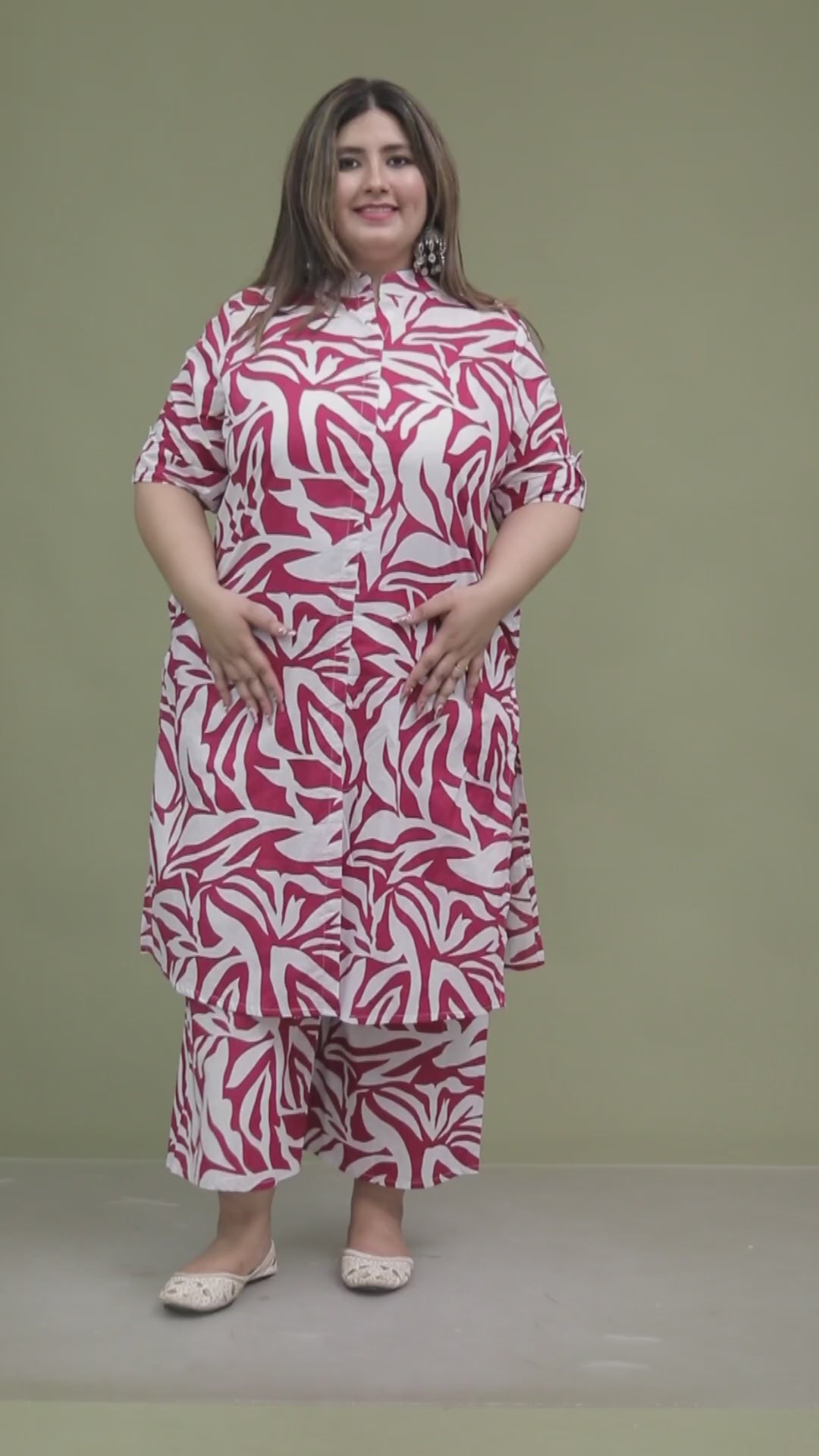 TROPICAL LEAFS PRINT COTTON 2 PEICE KURTA PLAZZO IN MAGENTA PINK BY PLUSSIZEKURTI