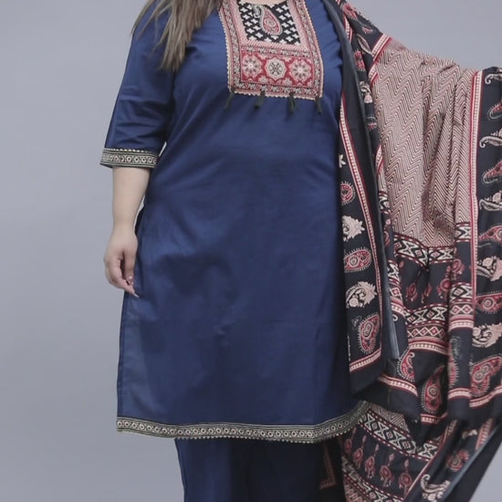 TRIBAL AJRAKH SOLID COTTON 3 PEICE KURTI PANT SET IN BLUE BY PLUSSIZEKURTI