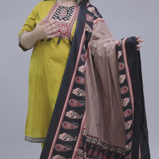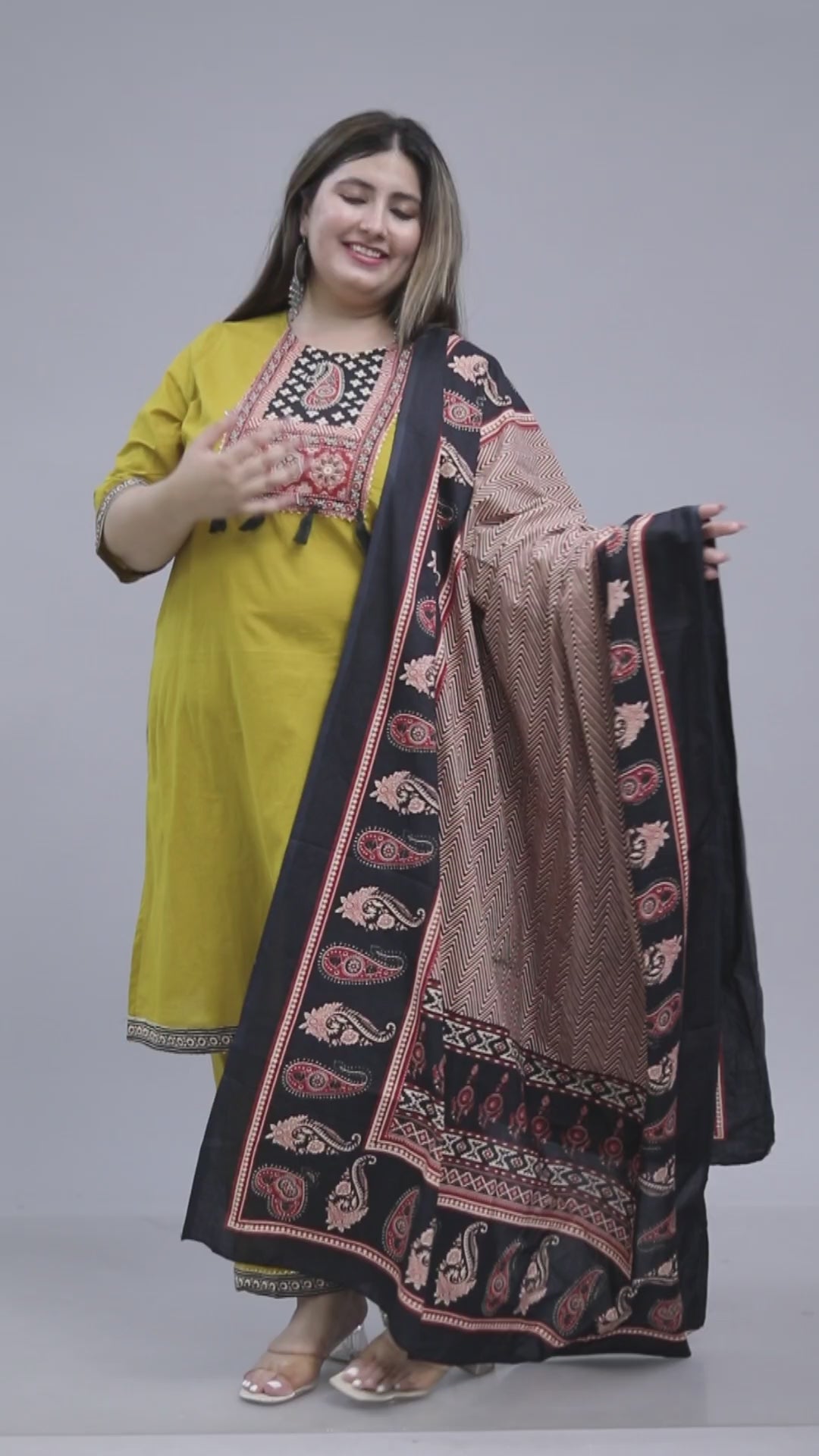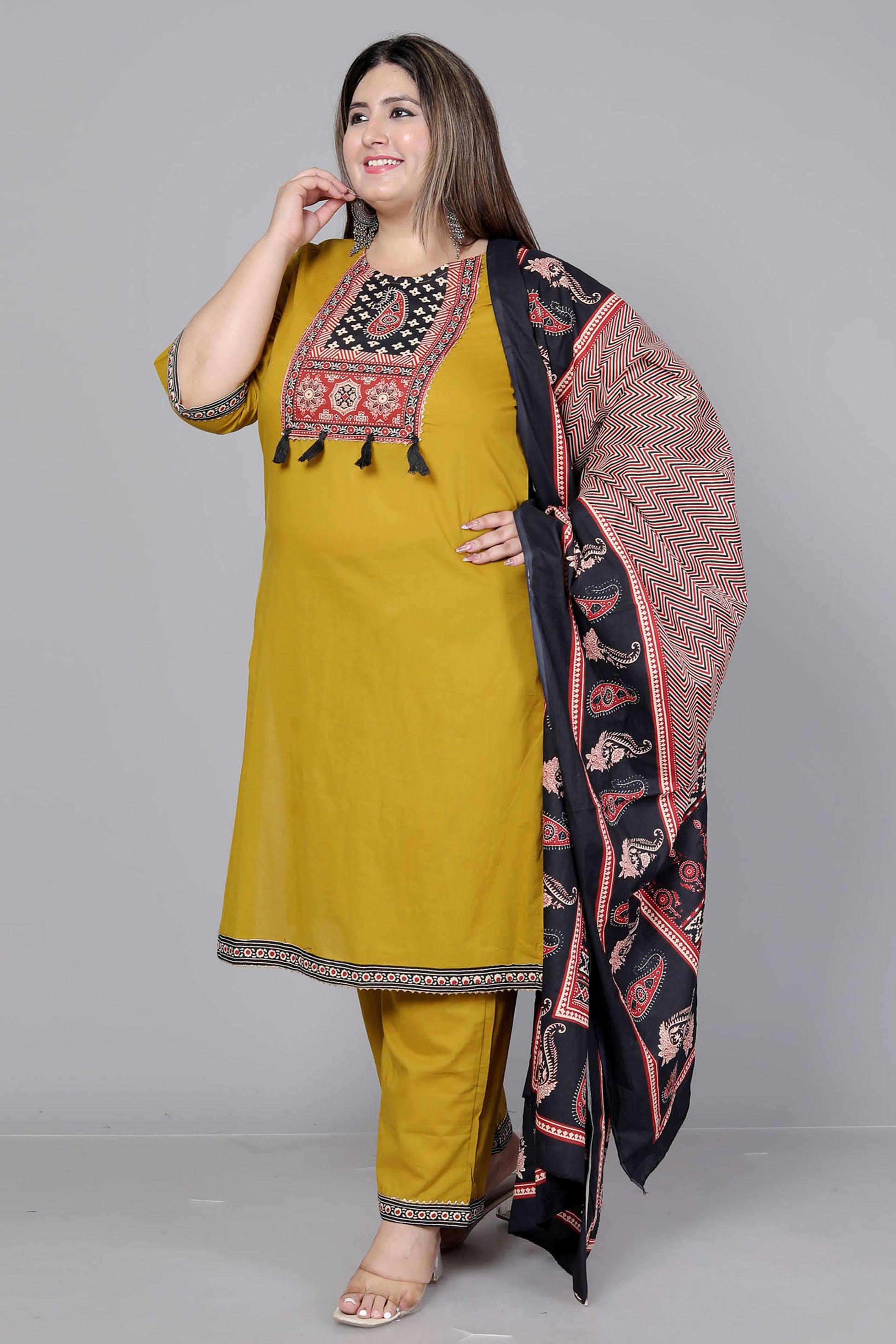 TRIBAL AJRAKH SOLID COTTON 3 PEICE KURTI PANT SET IN YELLOW BY PLUSSIZEKURTI