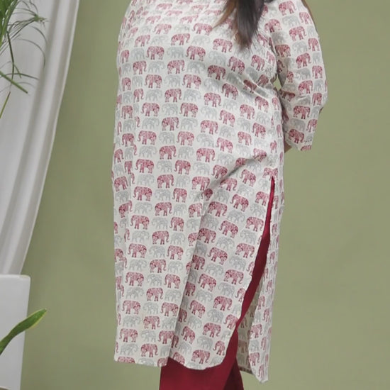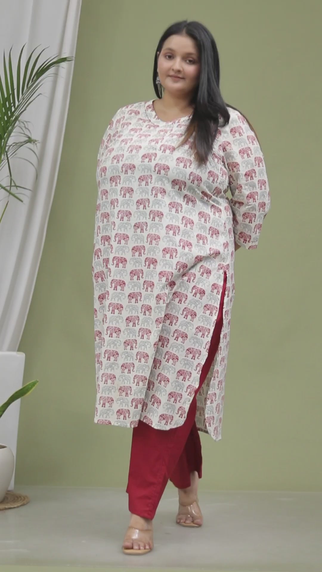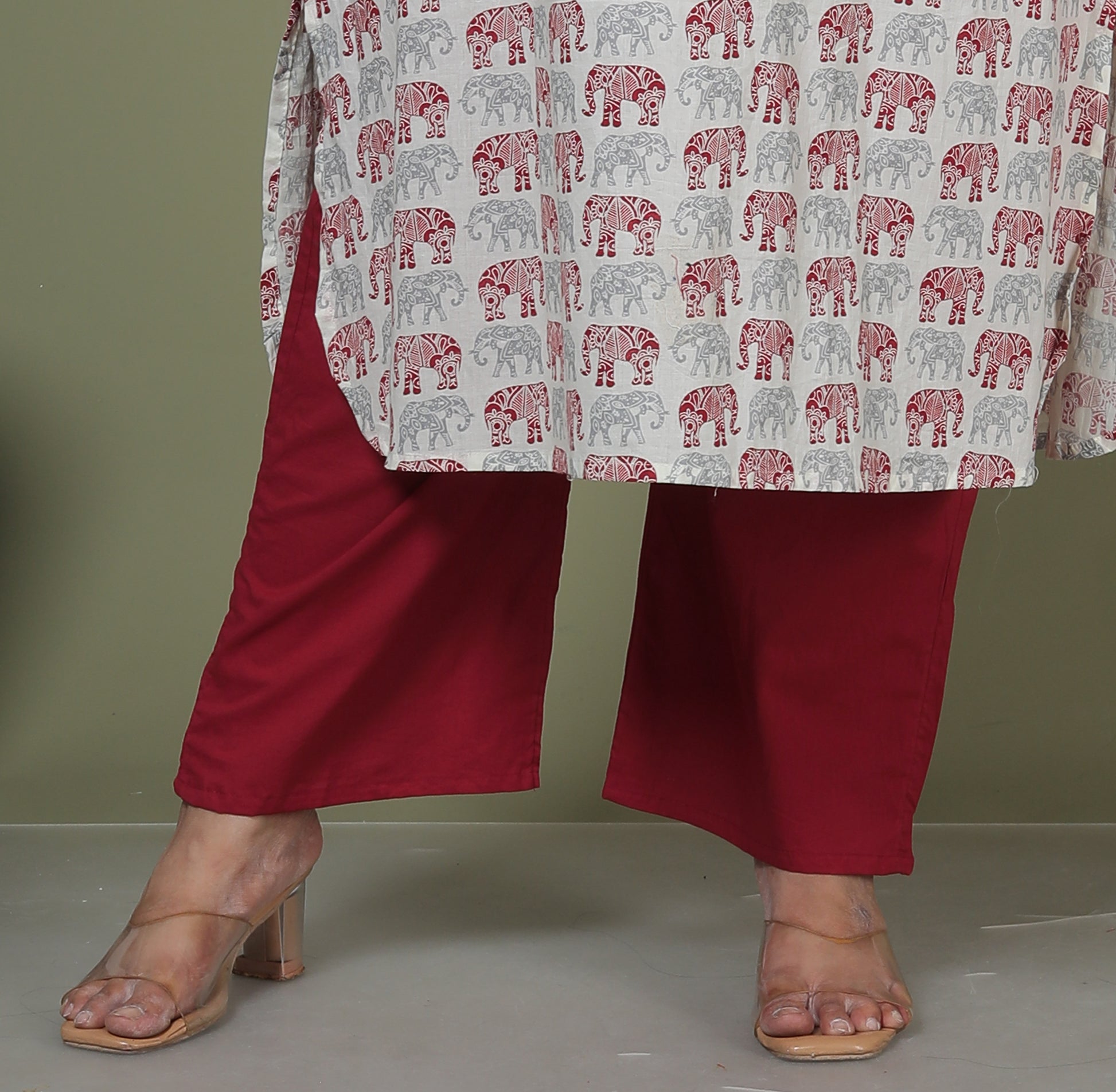 ELEPHANT MOTIF PRINT COTTON 2 PEICE KURTA PANT IN GREY/MAHROON BY PLUSSIZEKURTI