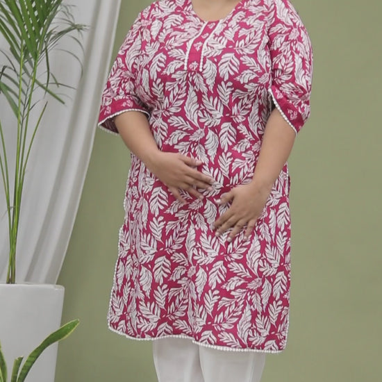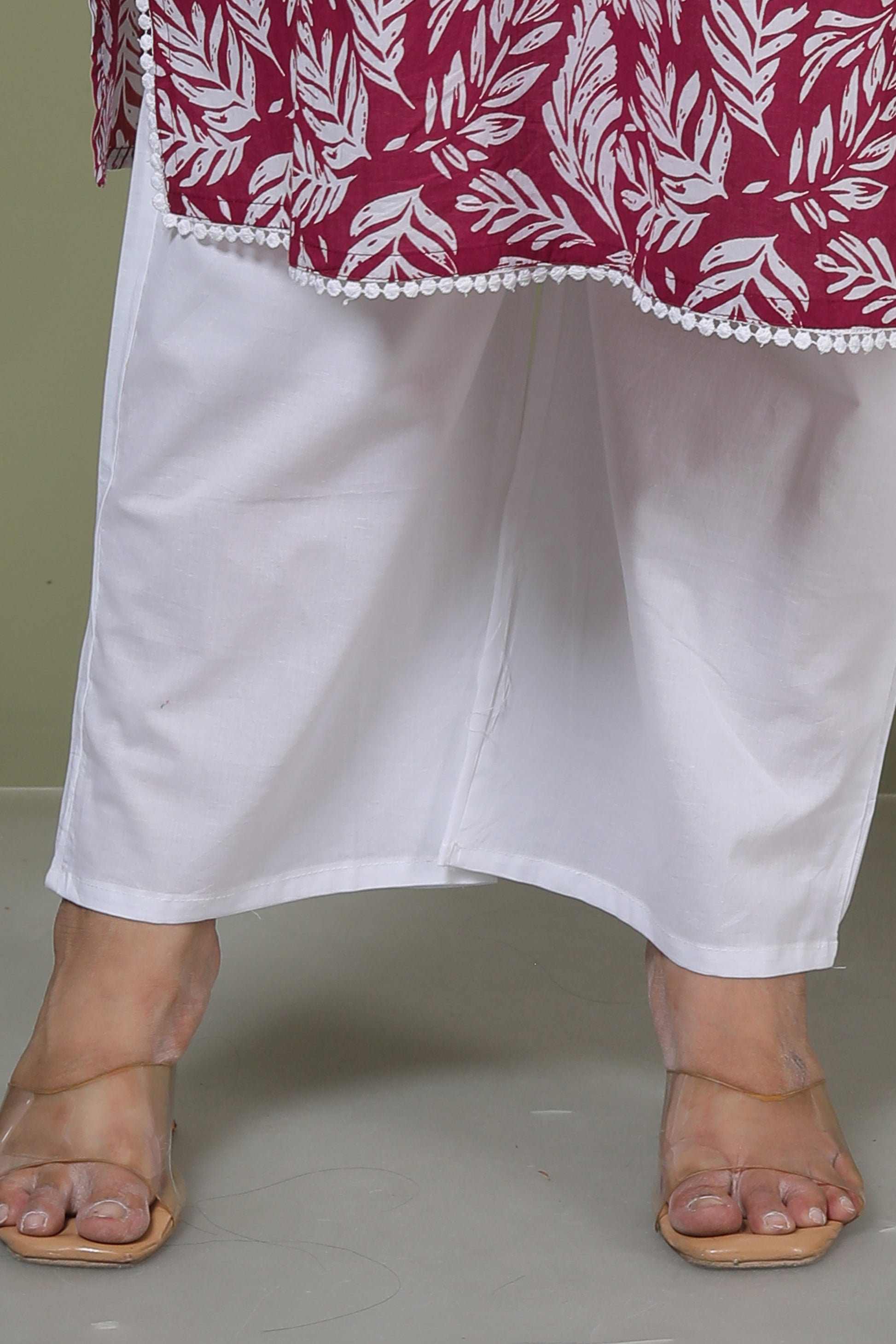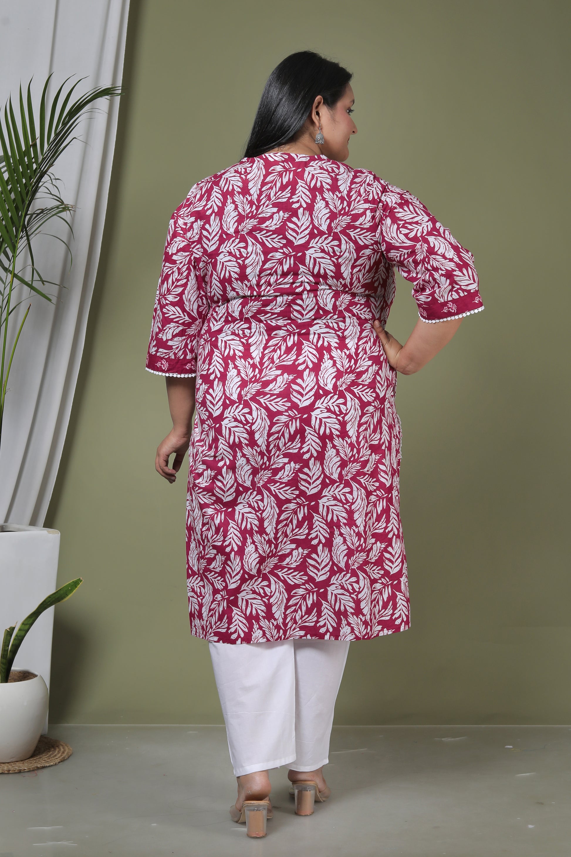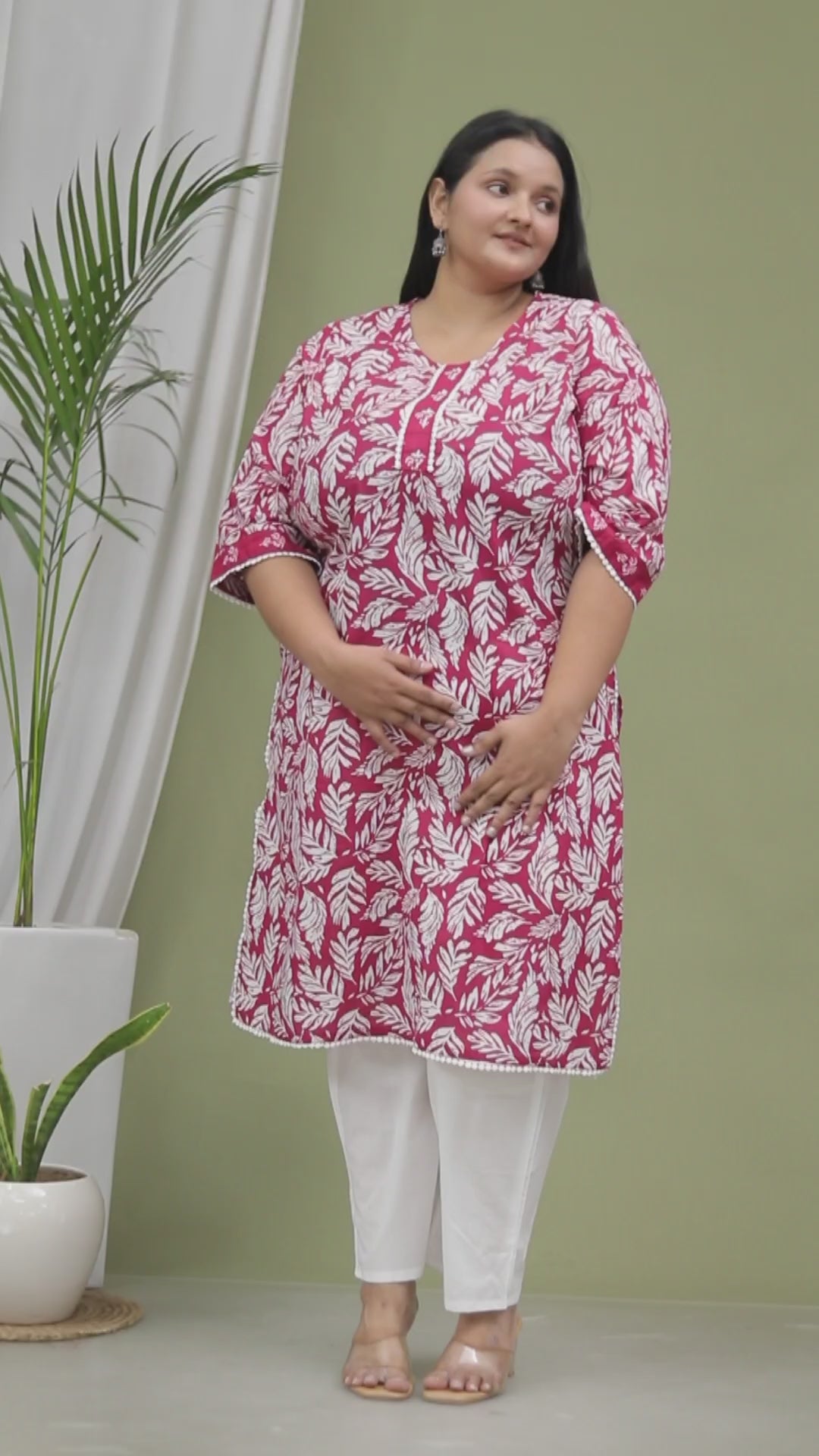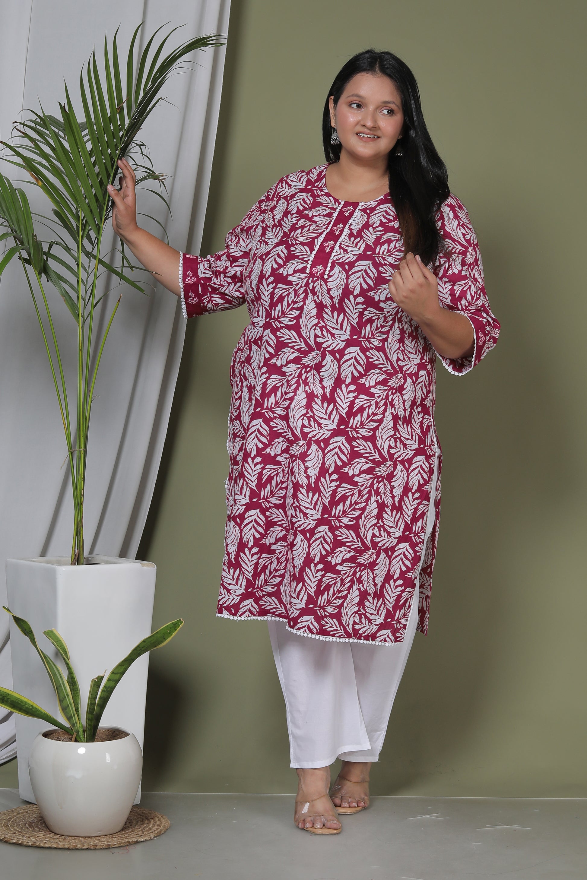 LEAF PRINT HANDWORK COTTON 2 PEICE KURTA PANT IN PINK BY PLUSSIZEKURTI