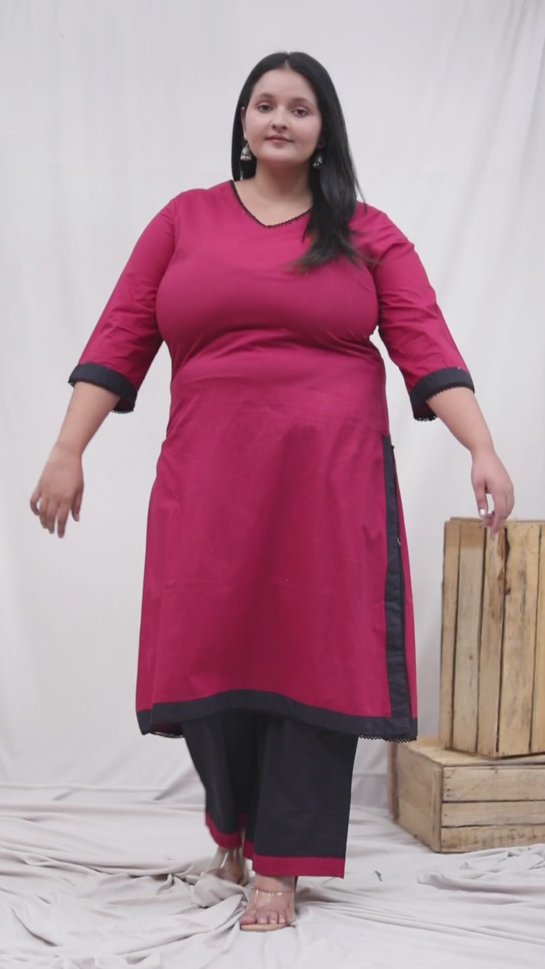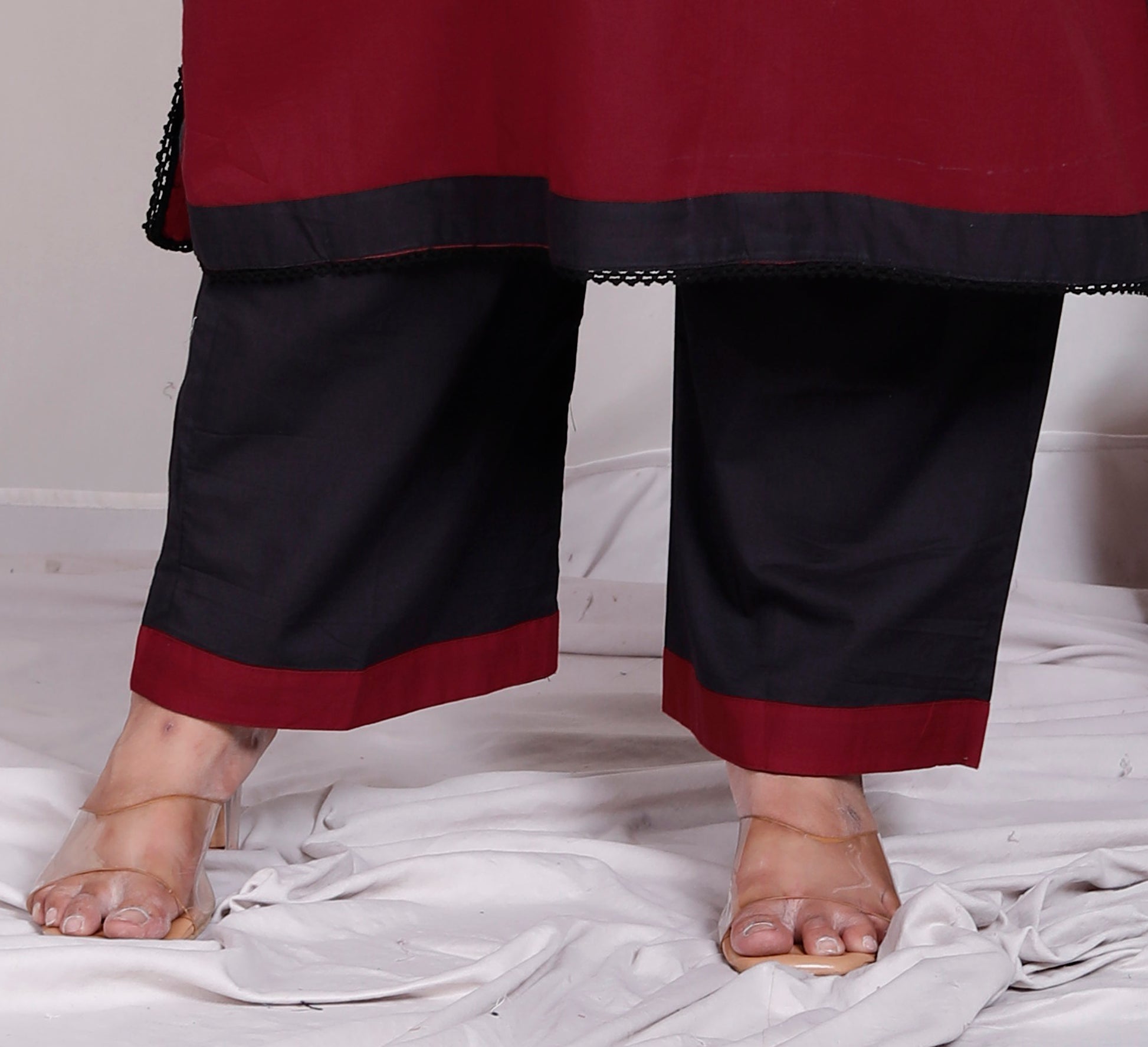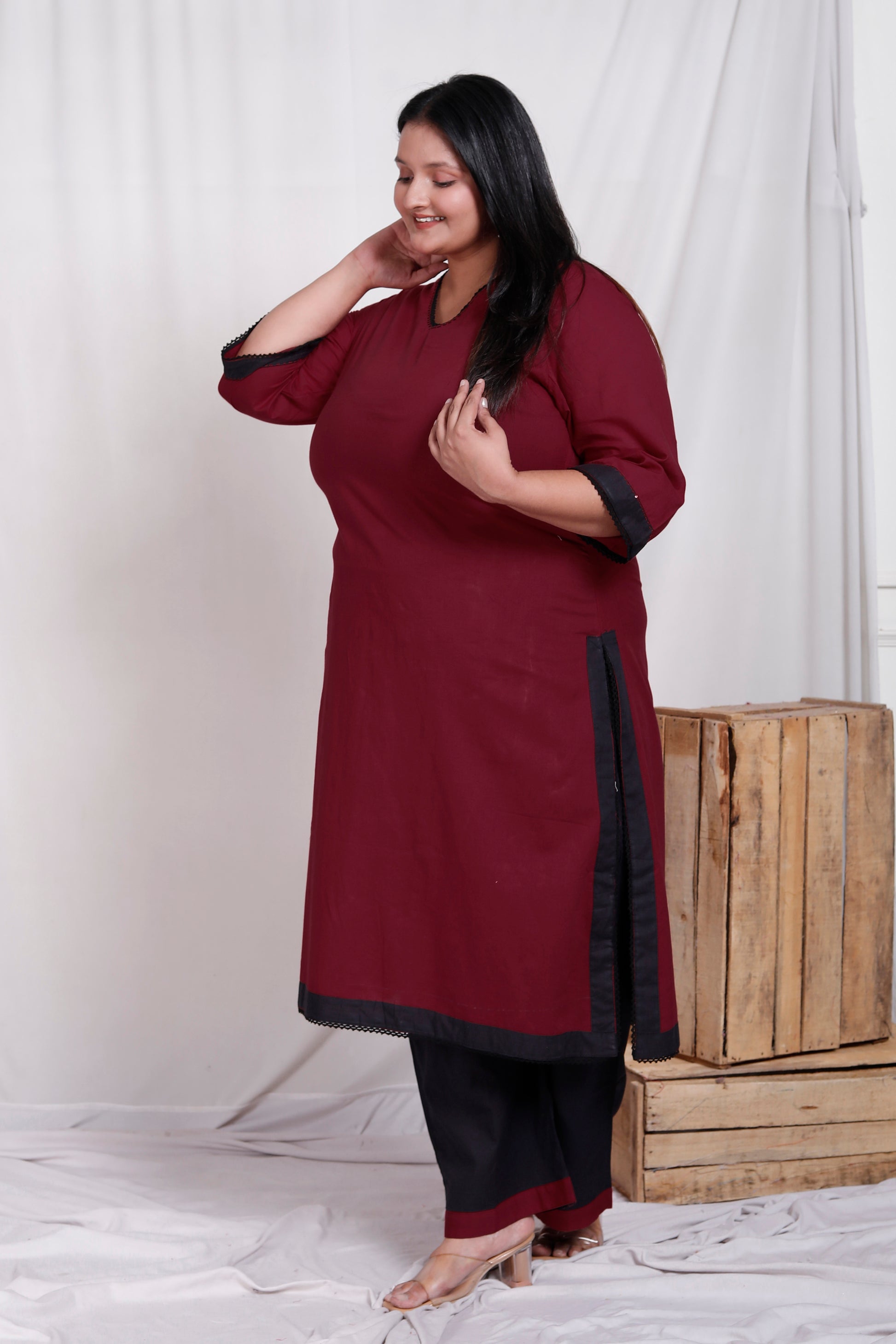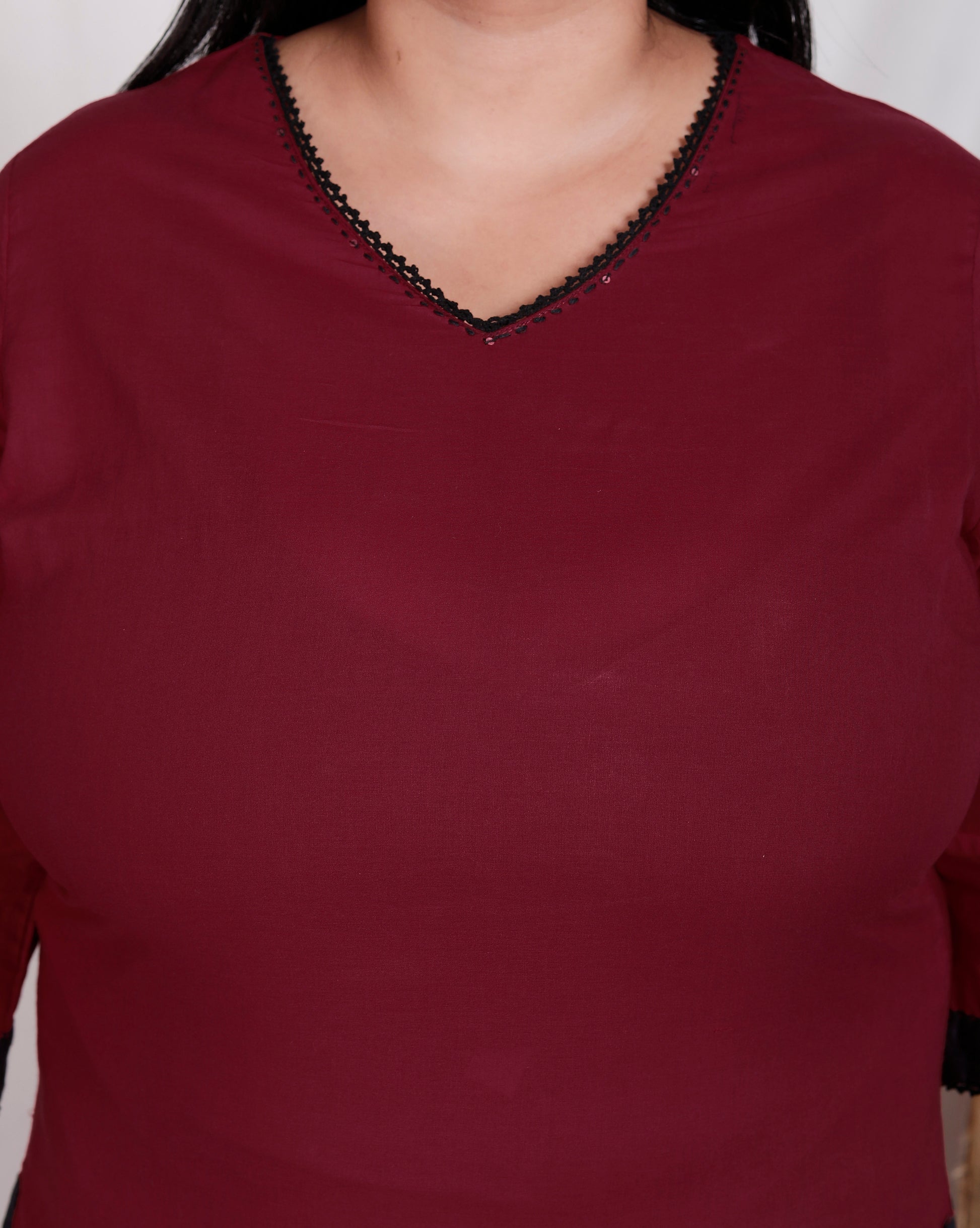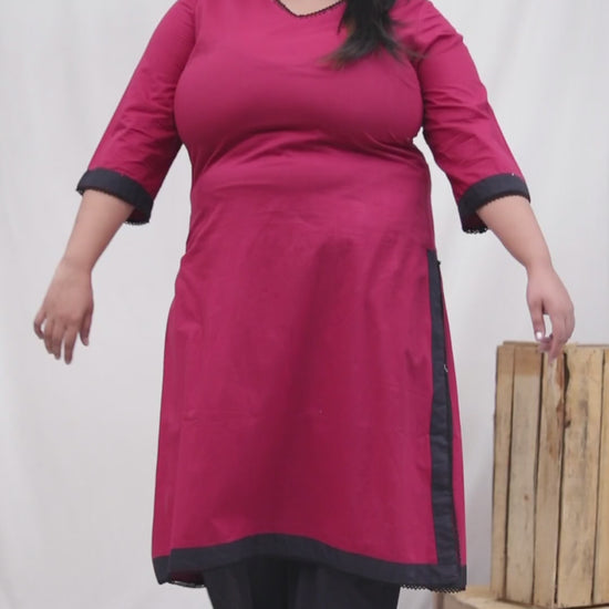 SOLID COTTON LACE WORK 2 PEICE KURTA PANT IN MAHROON/BLACK BY PLUSSIZEKURTI