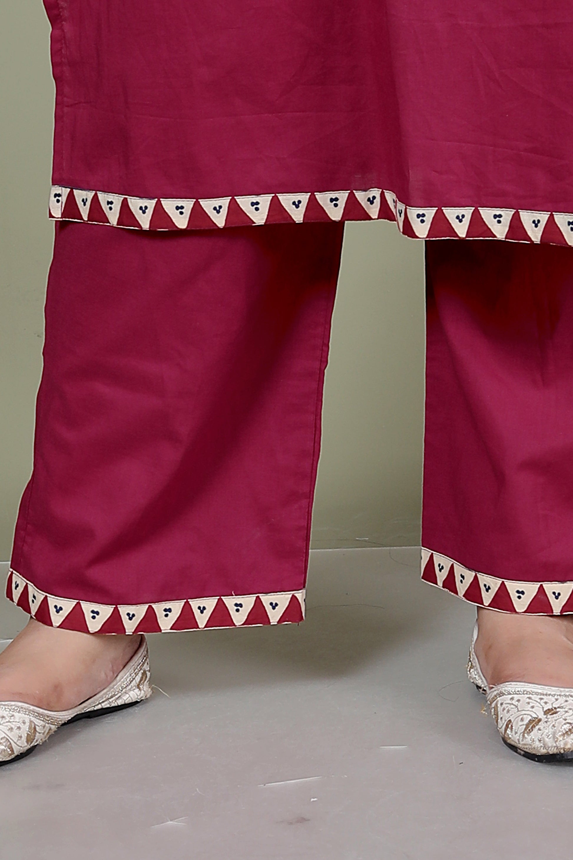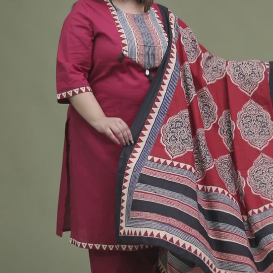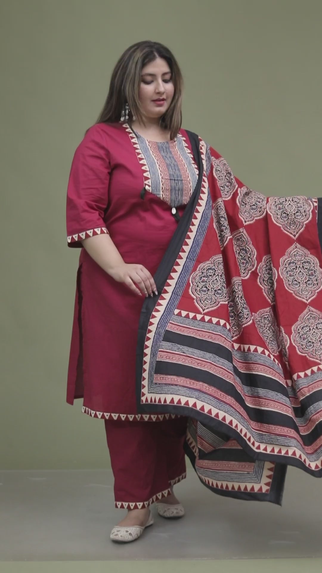 TRIBAL STRIPE SOLID COTTON 3 PEICE KURTI PANT SET IN MAHROON BY PLUSSIZEKURTI