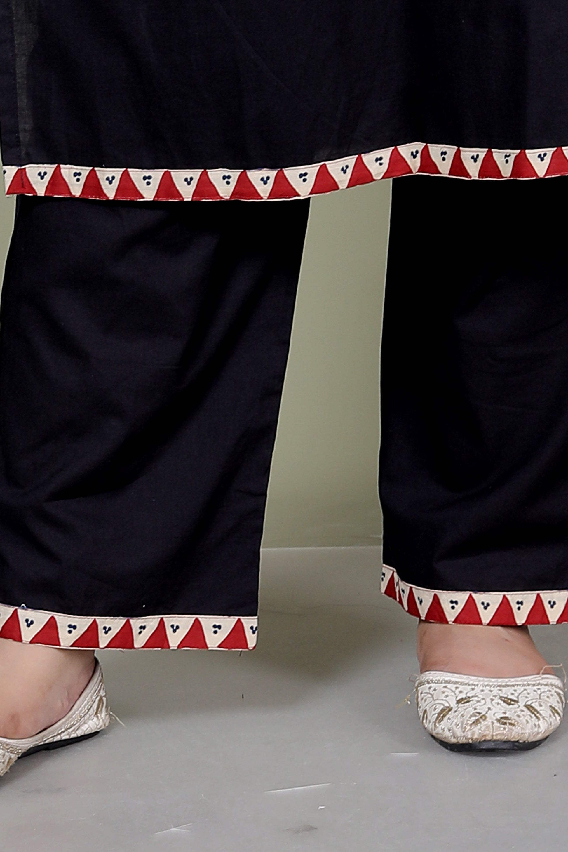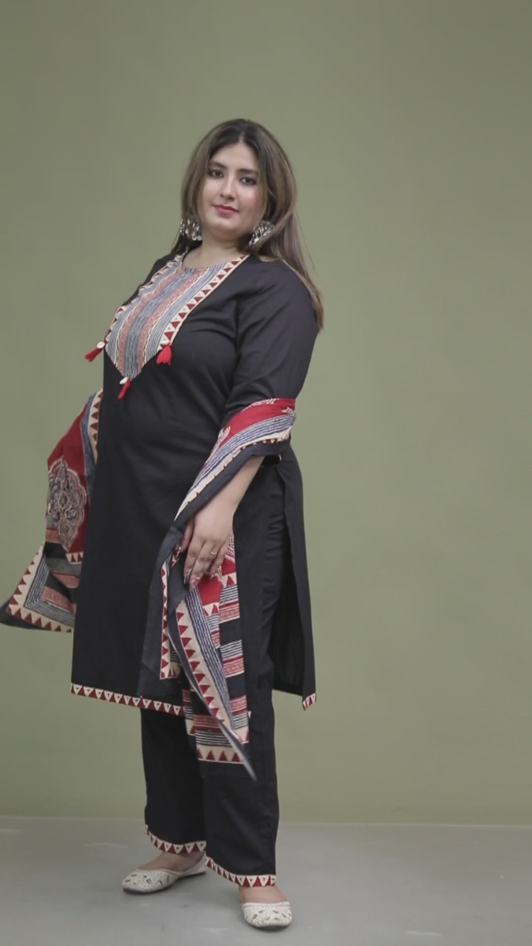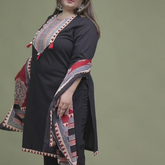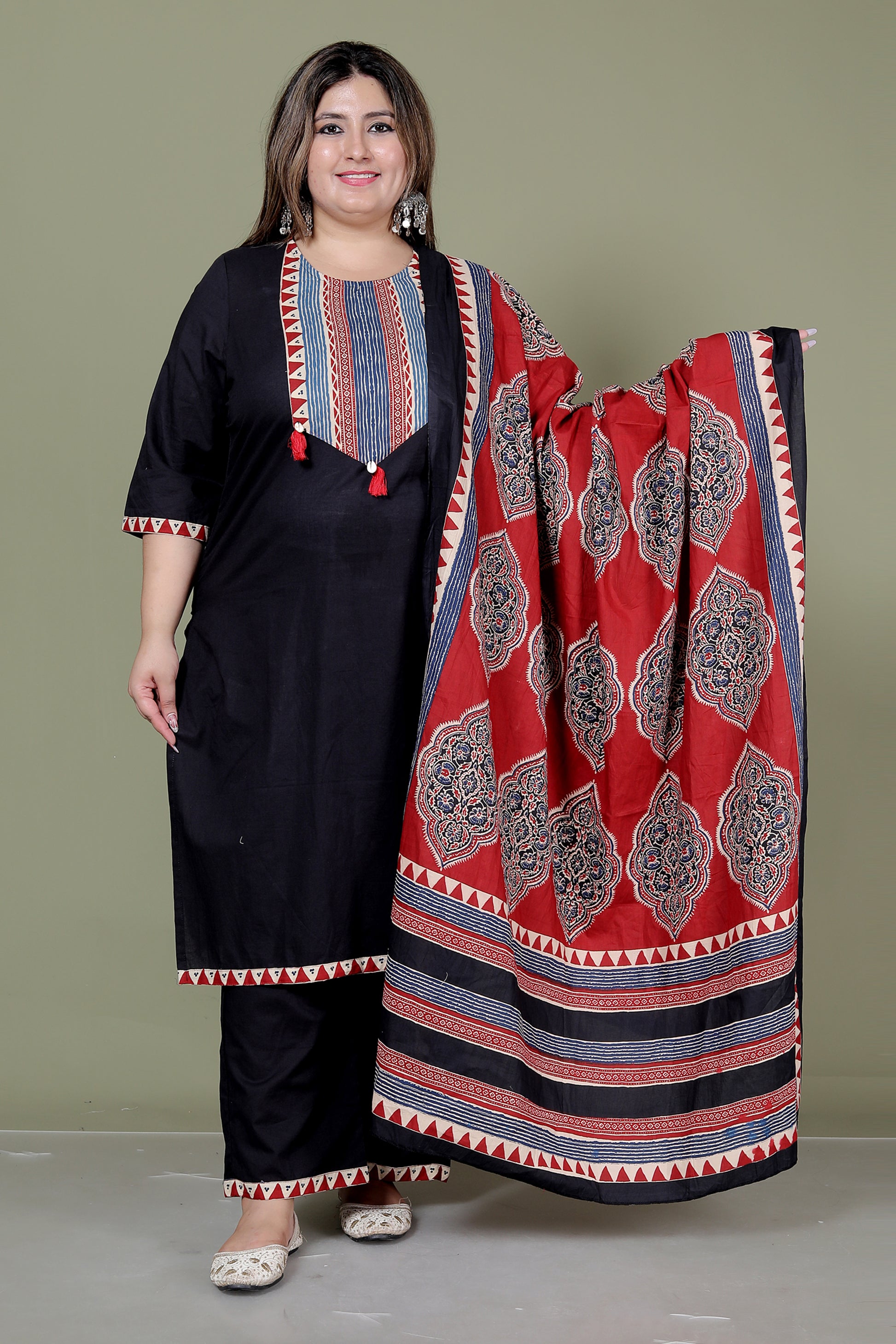 TRIBAL STRIPE SOLID COTTON 3 PEICE KURTI PANT SET IN BLACK BY PLUSSIZEKURTI