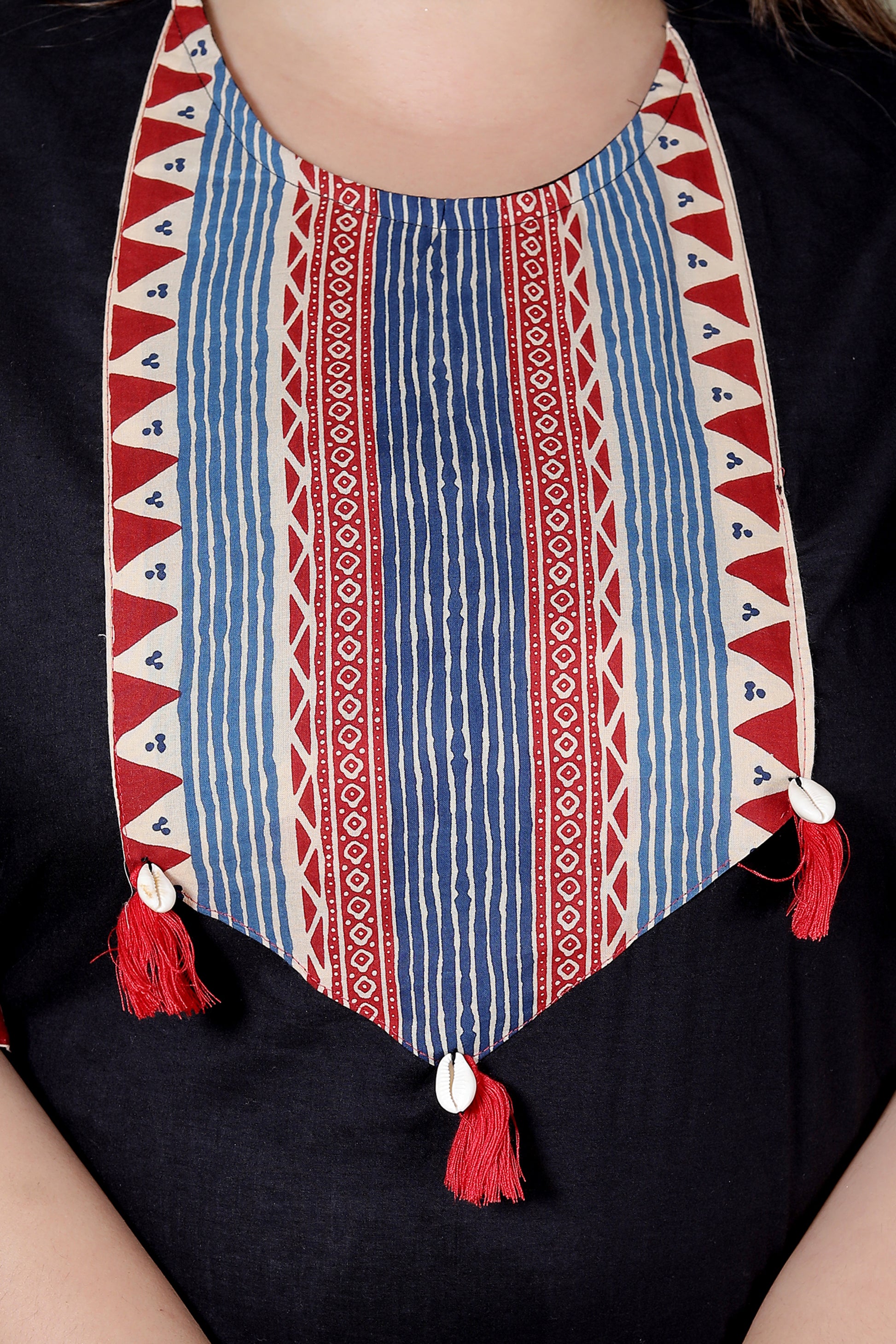 Kurti: Solid design with printed neckline & tassel detailing, length – 46