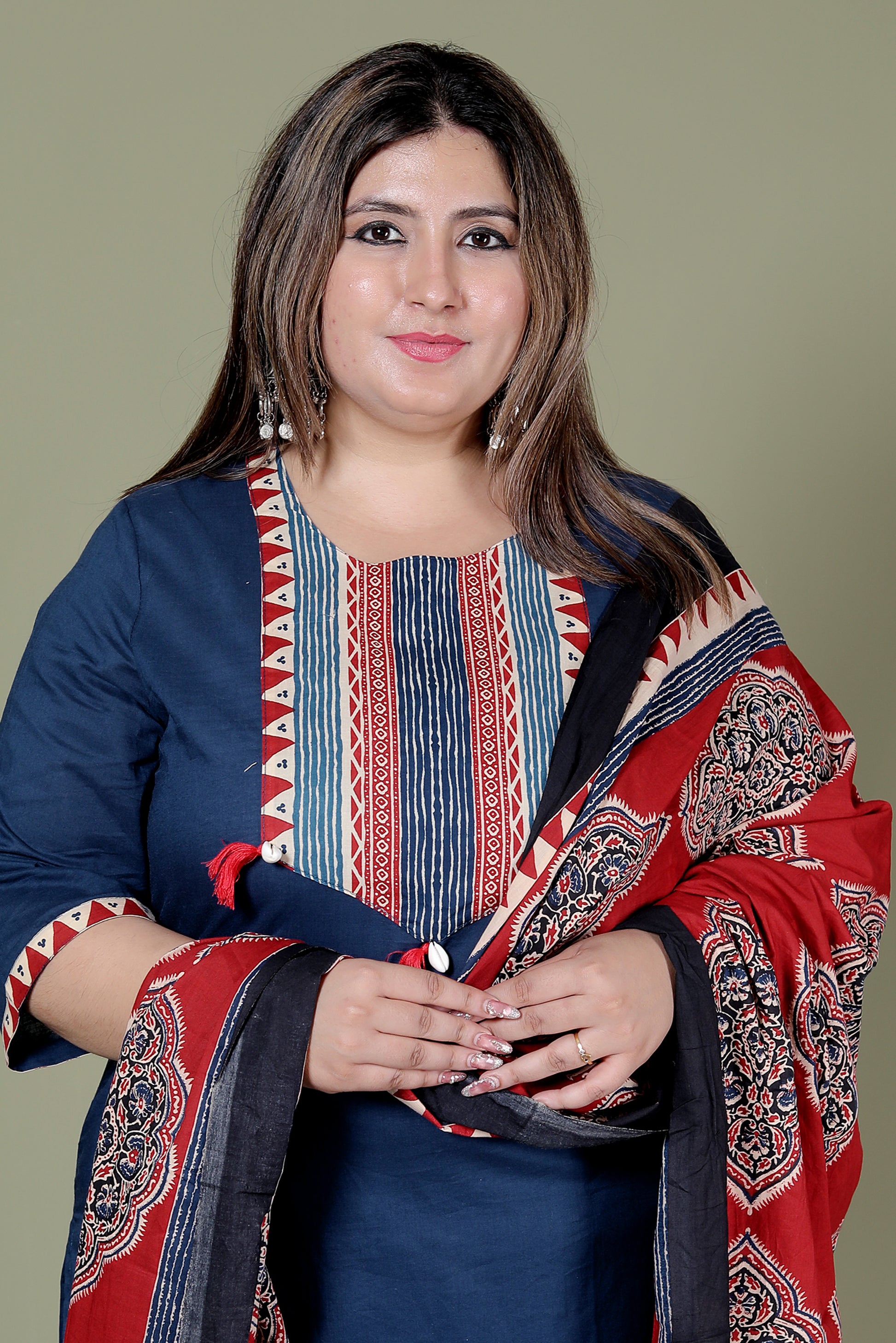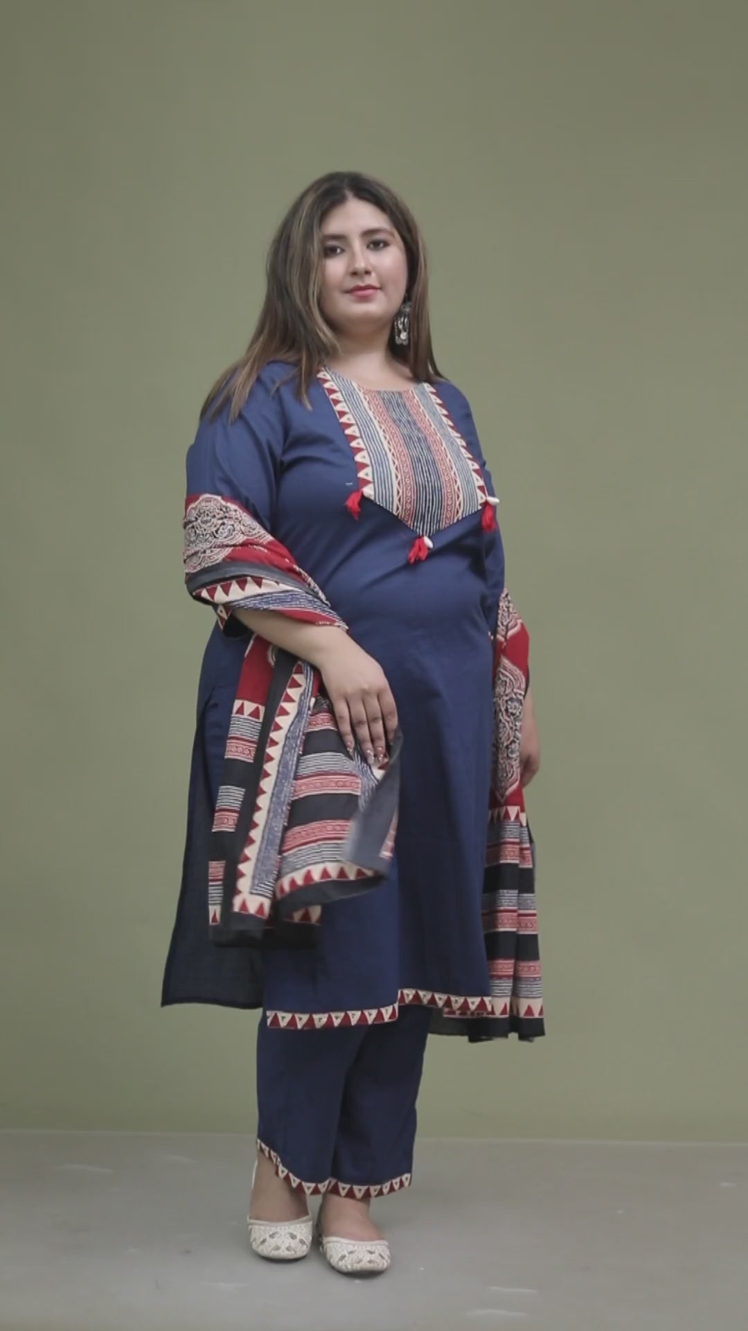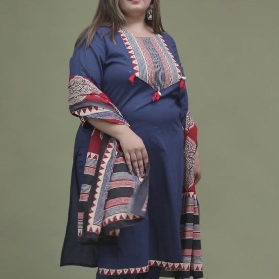 TRIBAL STRIPE SOLID COTTON 3 PEICE KURTI PANT SET IN BLUE BY PLUSSIZEKURTI