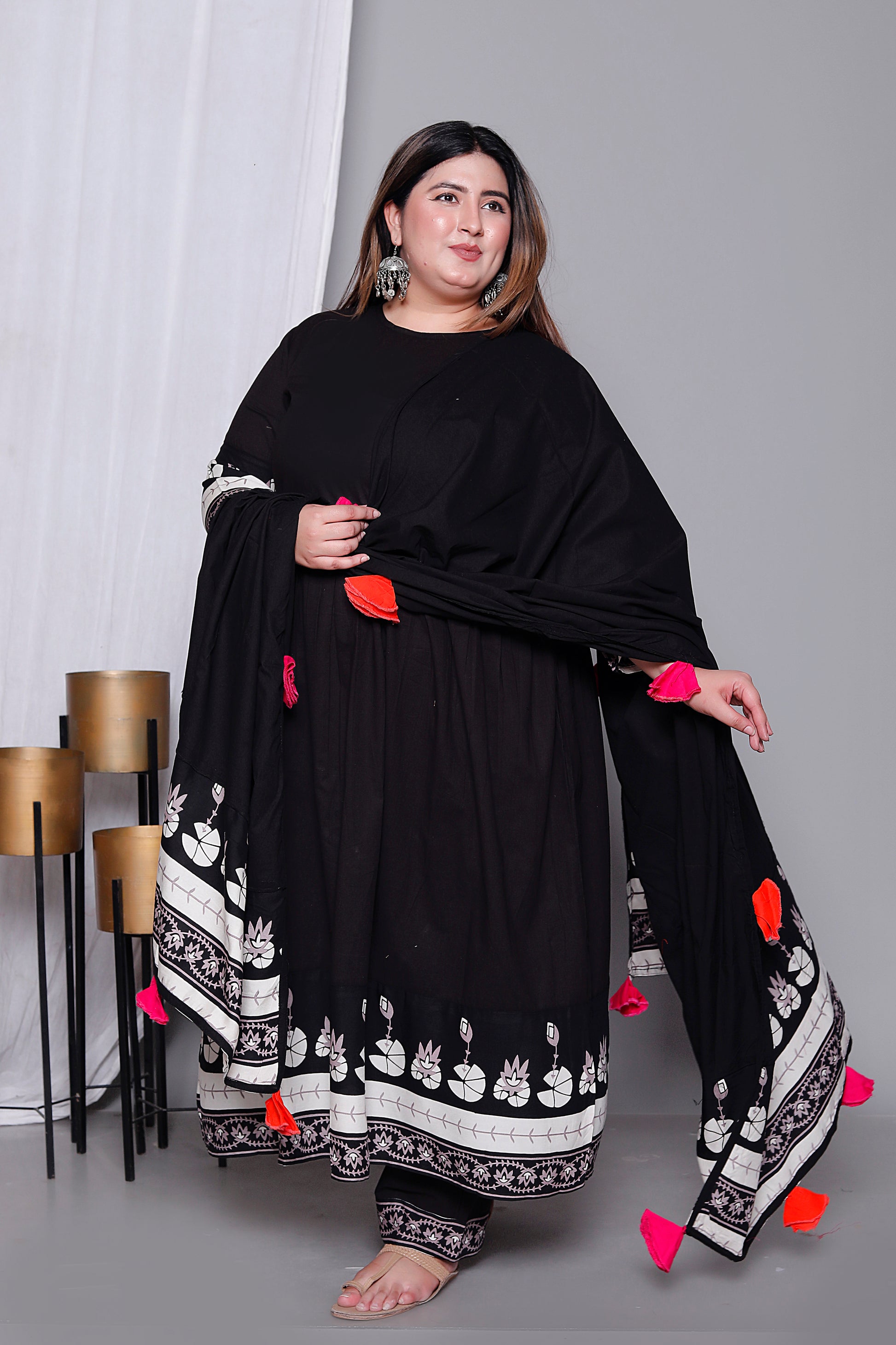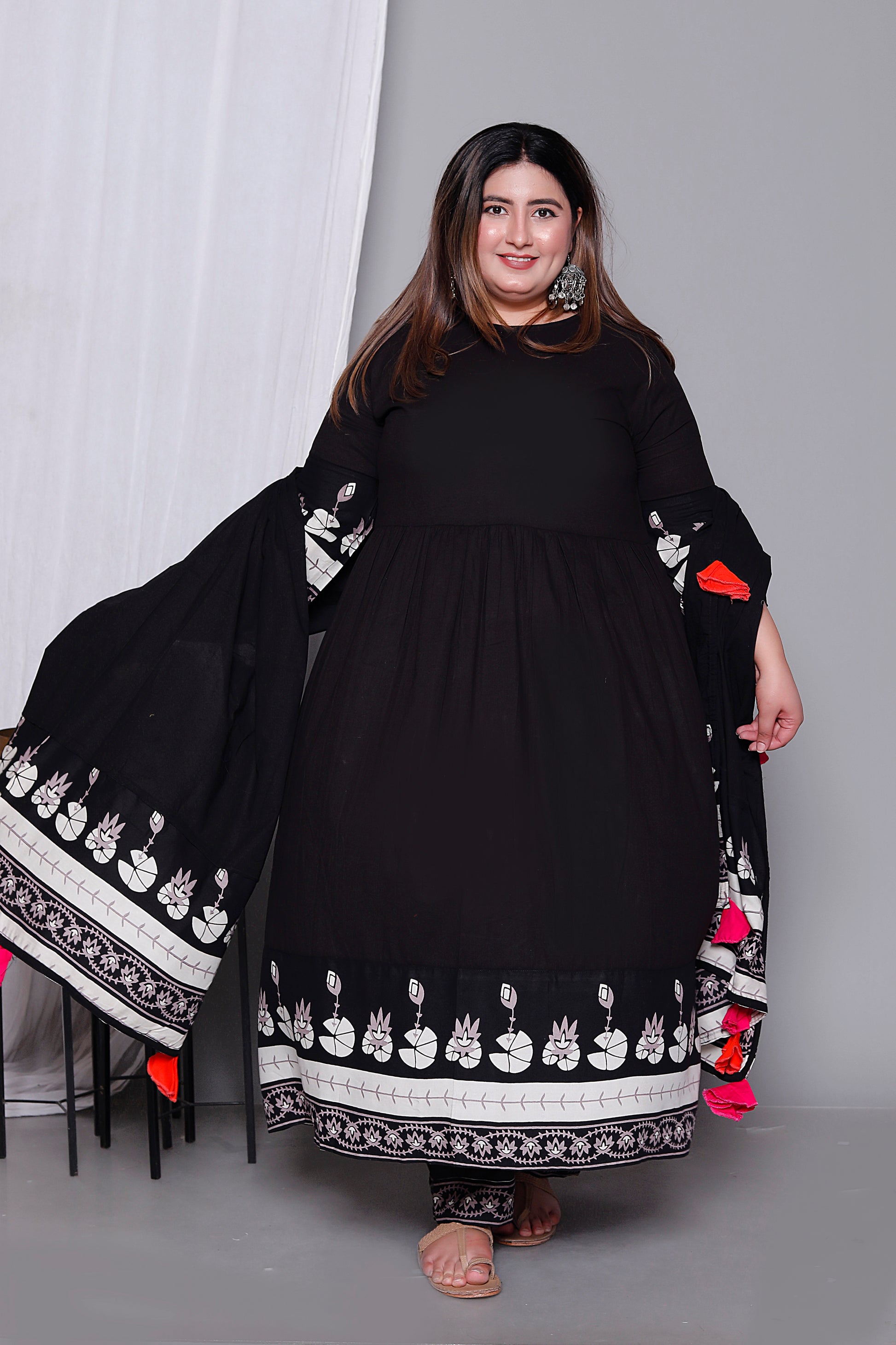 LOTUS BORDER ANARKALI SOLID COTTON 3 PEICE KURTI PANT SET IN BLACK BY PLUSSIZEKURTI