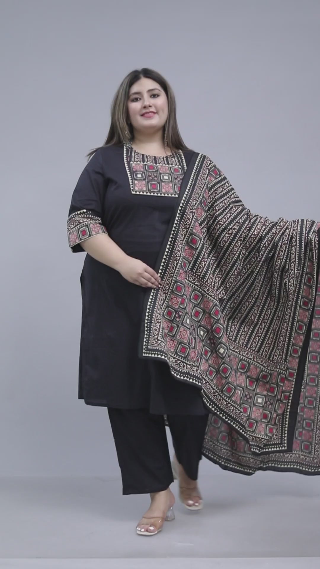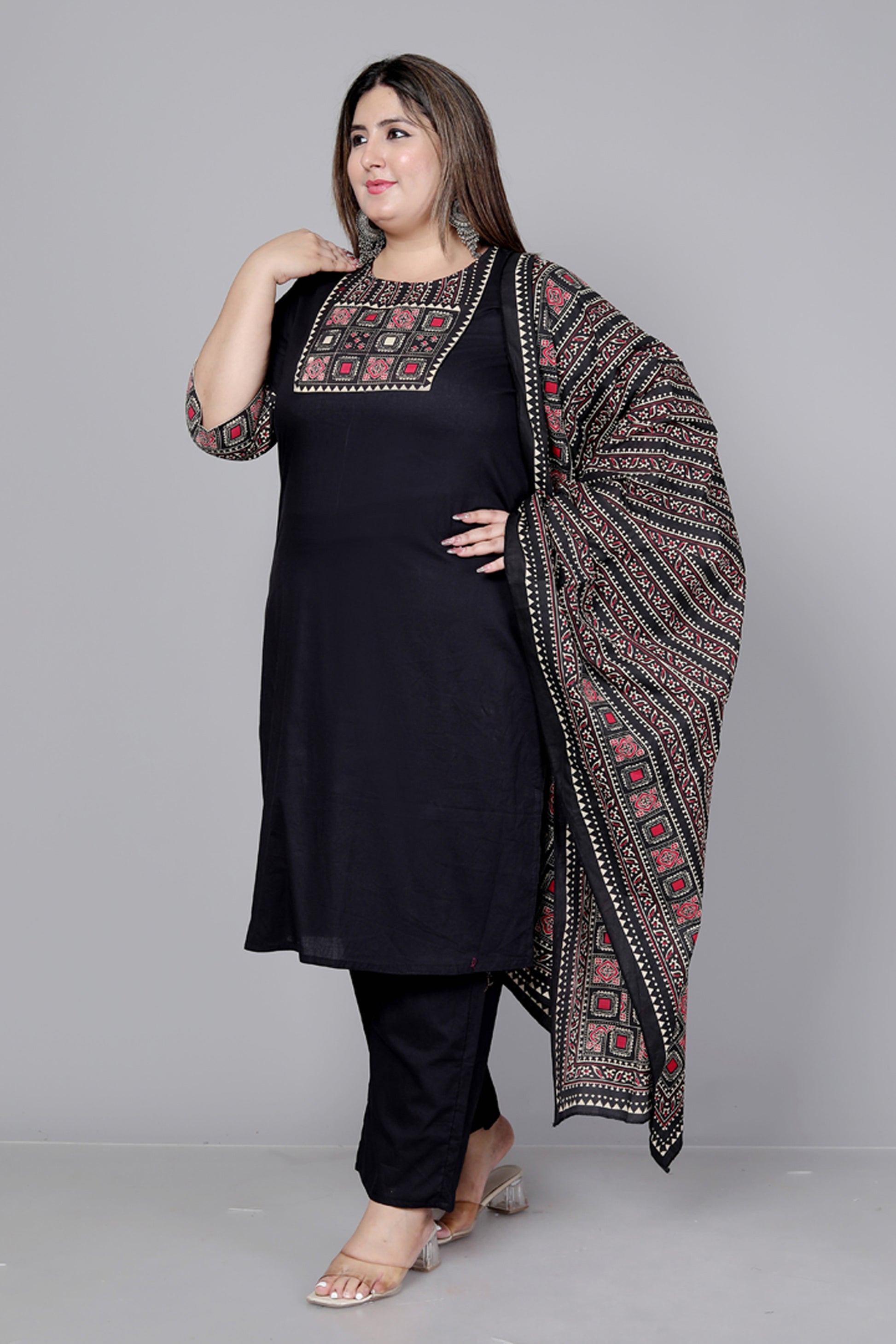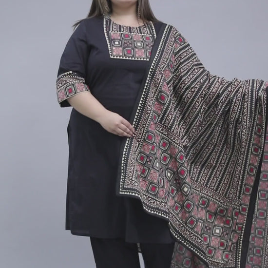 TRIBEL GEOMETRIC SOLID COTTON 3 PEICE KURTI PANT SET IN BLACK BY PLUSSIZEKURTI