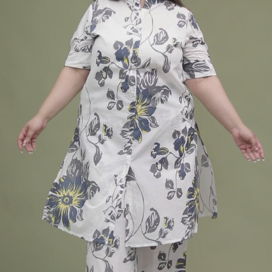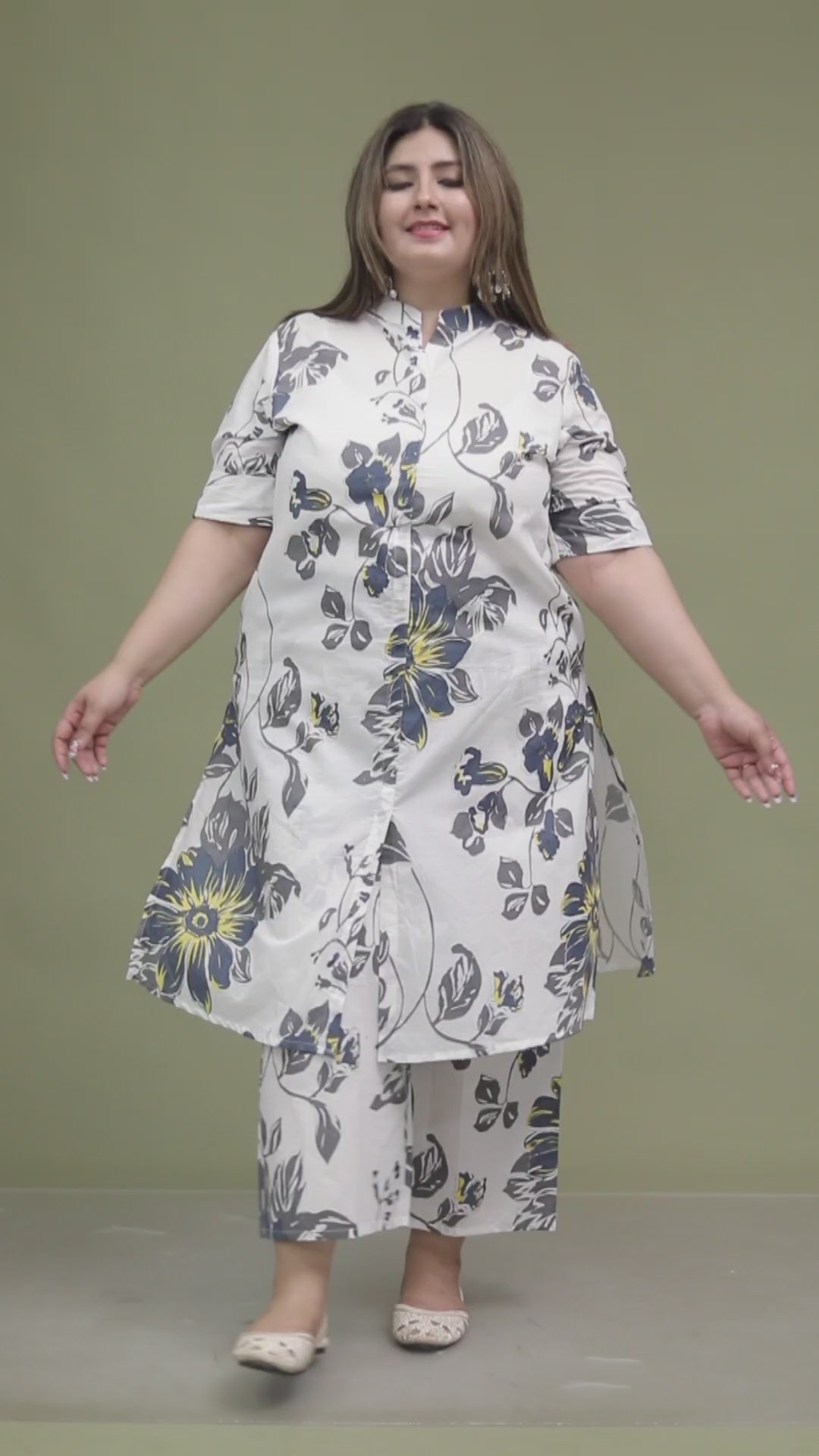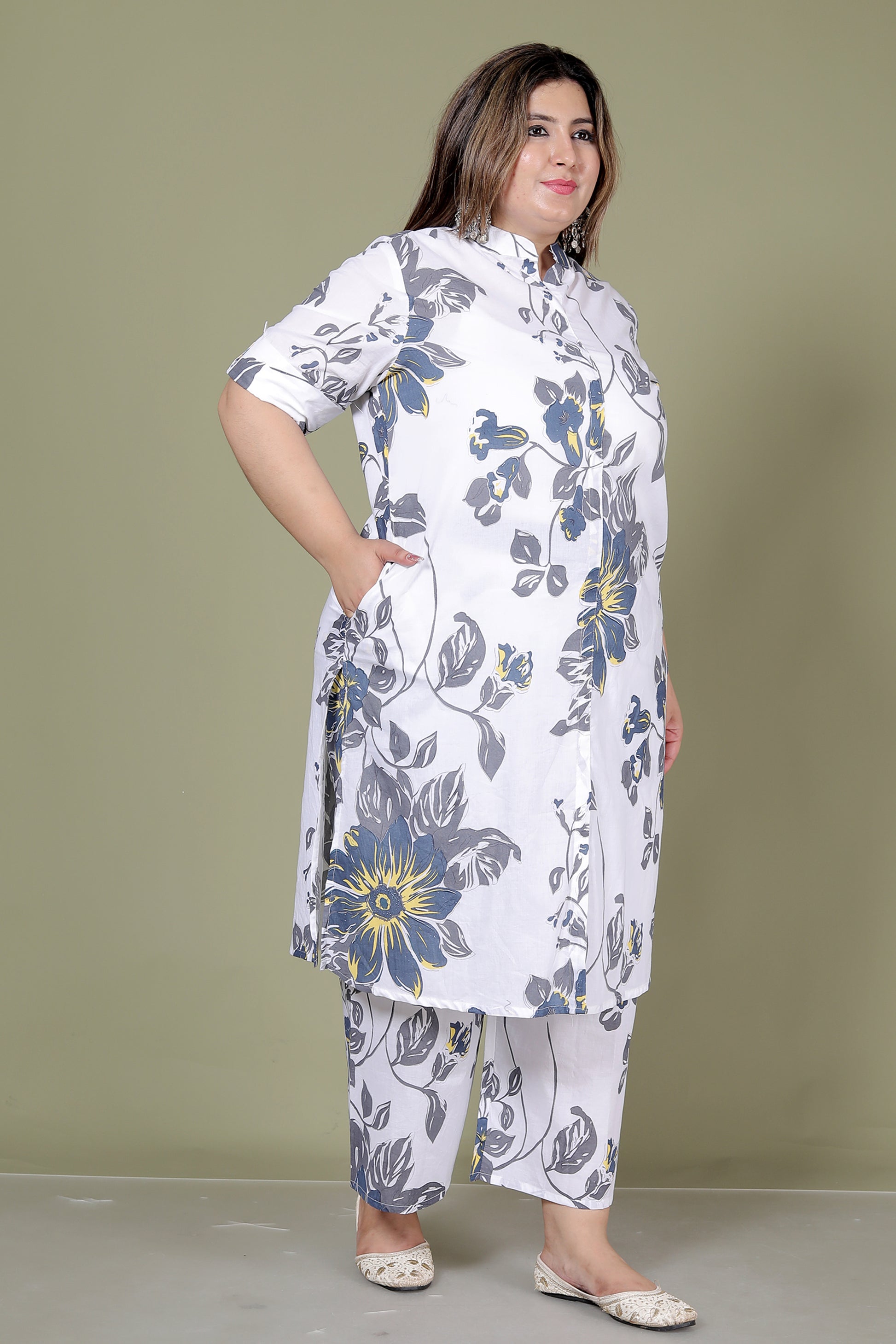 FLORAL SKETCH PRINT COTTON 2 PEICE KURTA PLAZZO IN WHITE BY PLUSSIZEKURTI